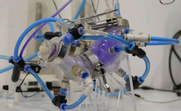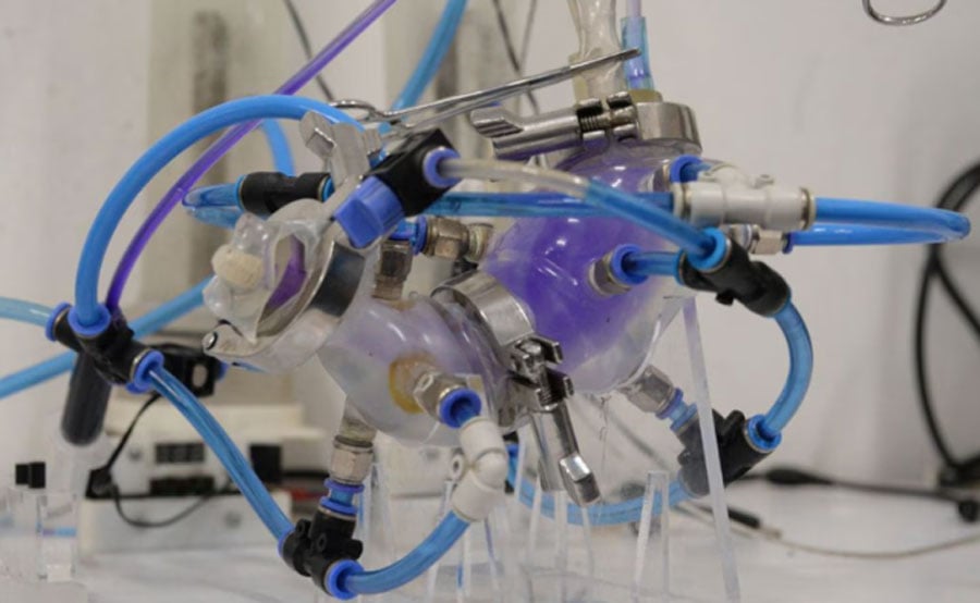 “Este es un estómago artificial con el que tratamos de emular el funcionamiento de un estómago humano. Lo hemos utilizado para desintegración de alimentos de manera muy exitosa con salchicha y melón, y funciona exactamente que el órgano natural, con tres y medio ciclos por minuto, se añaden jugos biliares y vemos la capacidad de desintegrar los alimentos”, detalló Ascanio Gasca.