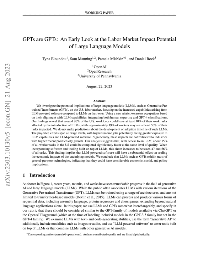 Our findings reveal that around 80% of the U.S. workforce could have at least 10% of their work tasks affected by the introduction of LLMs, while approximately 19% of workers may see at least 50% of their tasks impacted. We do not make predictions about the development or adoption timeline of such LLMs.