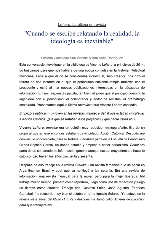 Este texto recoge la última conversación realizada al escritor, periodista y dramaturgo mexicano Vicente Leñero, una figura clave del periodismo narrativo y la literatura contemporánea en México. La entrevista funciona como un testamento intelectual en el que Leñero reflexiona sobre su obra, sobre el oficio de escribir y sobre la relación inseparable entre realidad, relato e ideología.