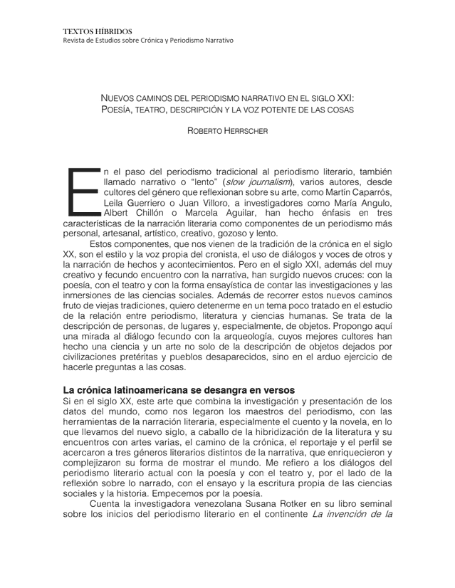 En este escrito, Roberto Herrscher analiza cómo el periodismo narrativo contemporáneo ha evolucionado para incorporar recursos provenientes de la literatura, la poesía, el teatro y las artes visuales. Su objetivo es mostrar que la crónica y el reportaje narrativo están viviendo una renovación profunda, impulsada por nuevas sensibilidades, tecnologías y formas de observar la realidad.