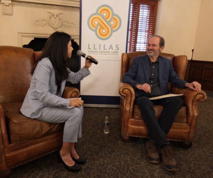 Juan Villoro conversa con Celeste González de Bustamante, directora del Mexico Center en el Teresa Lozano Long Institute for Latin American Studies de la Universidad de Texas en Austin. (Foto: Susanna Sharpe/LLILAS Benson)
